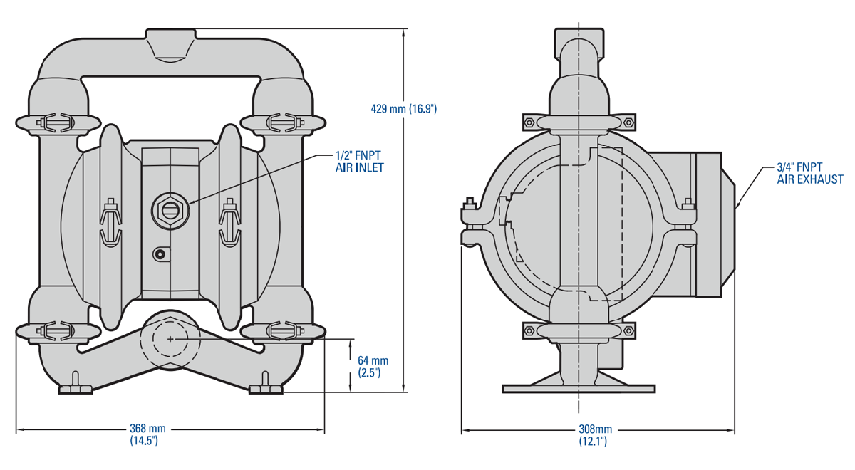 注意: 尺寸因材料和连接类型而异。更多相关信息,请参阅P4金属泵安装手册。