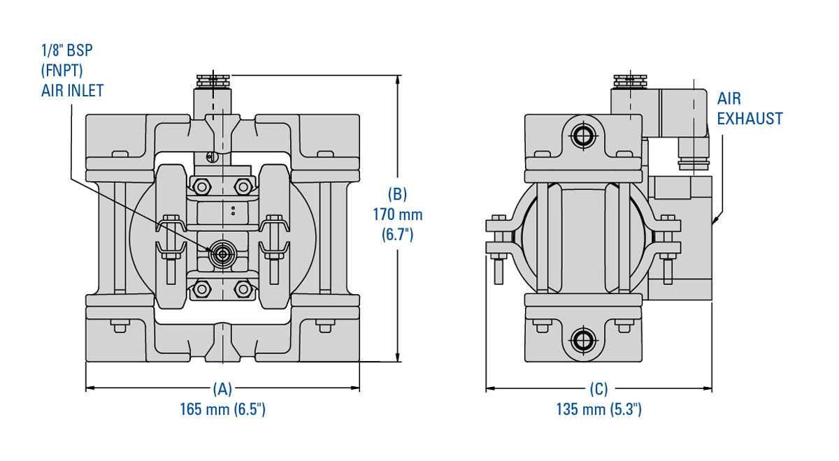 注意: 尺寸因材料和连接类型而异。更多相关信息,请参阅A.025金属泵安装手册。